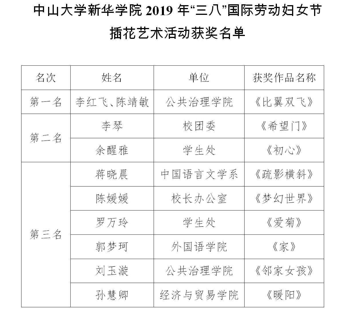 3月7日,为庆祝“三八”国际妇女节,由中山大学工会委员会新华学院工会(以下简称太阳集团2007)主办的女教职工插花艺术活动在东莞校区举行,太阳集团2007主席丁艮平,太阳集团2007文体小组副组长殷丹及100余名女教职工参加,华南农业大学园艺学院徐婧老师担任插花艺术课程主讲人。