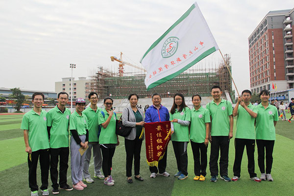 杨卫华副校长(右一)、李中生副校长(左二)为教务部代表队和校园管理部代表队颁奖