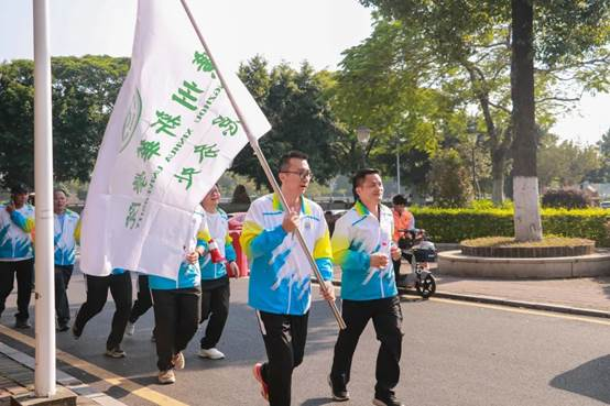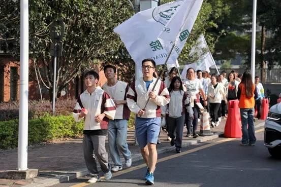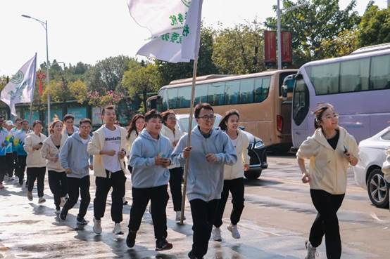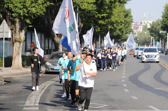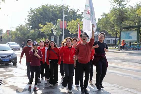 环校跑途中,教职工们挥舞着旗帜,响亮地喊着各队的口号,团队凝聚力随着脚下的步伐一点点凝聚,空气中洋溢着欢快的氛围,教职工们既锻炼了身体,又增进了感情。