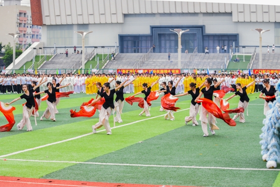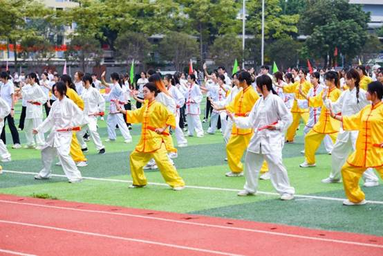 《奔跑的青春》以栩栩如生的舞姿和威猛的狮步,展示了中华民族优秀的传统文化,更展示了广州新华师生积极向上,青春活力的精神风貌。红扇翻飞,衣袂飘舞,千人千色的《太极之韵》引人注目,舞者们灵动柔美的舞姿,诠释着国风之美。《舞动青春》健身操舞表演上,红黄交融,火力全开。轻扬的音乐谱写生命的节奏,整齐的动作传递青春的活力。广州新华学子们以舞步执新笔,以青春绘未来。