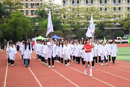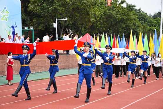 开幕式上,庄严的国旗护卫队与校旗护卫队目光坚定,步履铿锵,踏着整齐的步伐昂首阔步走过主席台。各院系代表方队神采飞扬,英姿飒爽,踏着坚毅的步伐走过田径场,展现了广州新华师生们朝气蓬勃、积极向上的精神风貌。
