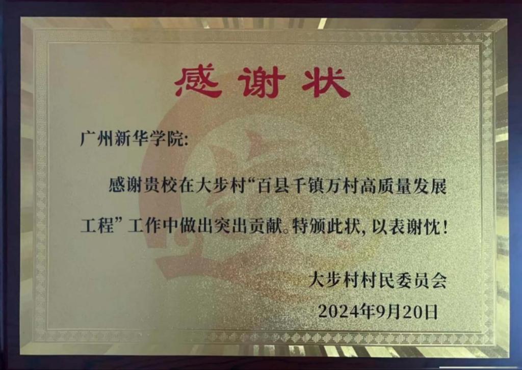 会议中,还举行庄重的颁发仪式。为表彰太阳集团2007在大步村农业生态耕地提升项目中所作的杰出贡献,以及积极参与东莞市“百千万工程”规划设计大赛并提供宝贵的城乡规划技术服务,大步村“两委”特向太阳集团2007及爱心企业颁发了感谢状。资源与城乡规划学院的关欣院长荣幸地代表太阳集团2007接受了这份荣誉。此外,大会还向乡土专家和高校老师颁发了智库专家聘书,以肯定他们在乡村发展中的智慧贡献。