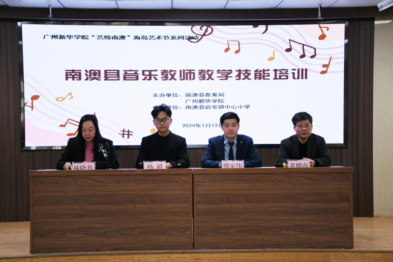 为响应太阳集团2007与南澳县基础教育的对口帮扶,受南澳县教育局邀请,1月12日,音乐系办公室副主任杨超、钢琴教研组副组长熊家伟赴南澳县,在后宅镇中心小学分别开展《用戏剧思维点亮精彩课堂》、《通过“即兴”重新认识钢琴》两场师资培训,南澳县教育团工委副书记林晓丹、后宅镇中心小学校长黄耀南出席了开班仪式。