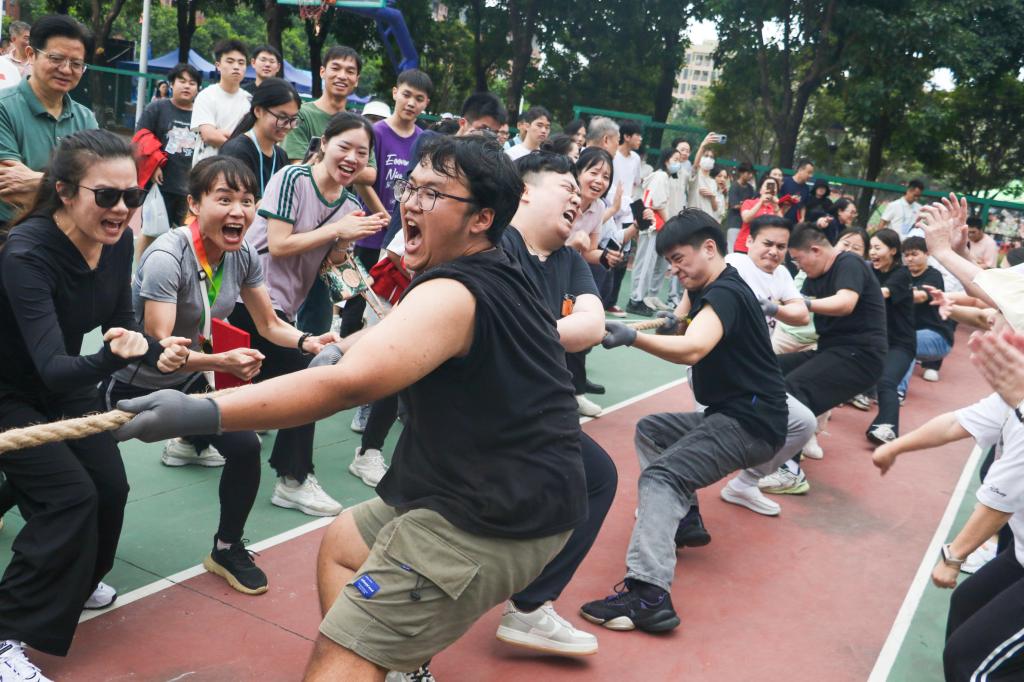参赛的队员们紧握长绳,卯足了劲拼命往后拉,双方啦啦队的队员们也在队伍旁边助阵加油,呐喊声此起彼伏,充分展现了教职工们顽强拼搏的体育精神。