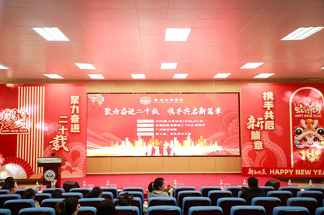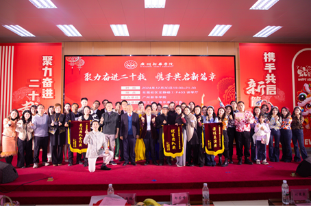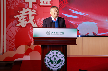 王庭槐在致辞中指出,2024年是学校落实“十四五”规划的冲刺之年,全校教职员工坚守教育初心,牢记“为党育人、为国育才”的教育使命,在教育教学改革、学科专业建设、学术科研创新、校园文化建设、迎评促建等方面取得了新成绩,展现了广州新华人的风采。展望2025年,学校将继续坚持立德树人的根本任务,持续深化教育教学改革,创新人才培养模式,提升人才培养质量,努力培养更多堪当民族复兴大任的时代新人。预祝本次晚会圆满成功!谢谢大家!祝大家在新的一年里,身体健康,巳巳如意,事业蒸蒸日上,家庭幸福美满!