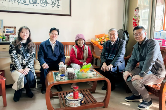 王庭槐(右二)、郝登峰(左二)一行到学校原院长陈伟林教授家看望慰问,与陈院长夫人郑美莲教授(中)亲切交流