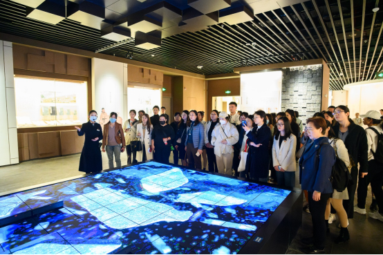 在展厅工作人员的引导和讲解下,教职工们参观了中国国家版本馆广州分馆(文沁阁)多个展厅,感受“千秋写印 华夏有章——中华版本发展概览”以中华版本形态嬗递之序,从版本源流、材质更新、技术进步等角度出发,展示中华版本的演变历史,彰显中华文化的独特魅力;“红色印记 映照初心——红色广东专题版本展”以新民主主义革命历史脉络为线索,通过红色版本讲述中国共产党在广东团结带领人民进行革命斗争的光荣历史;“互鉴千年 融通未来——海上丝绸之路专题版本展”以时间为经、版本为纬,通过海上丝绸之路各个历史时期留存典籍、绘画、照片等版本,呈现波澜壮阔的文明交流互鉴史,彰显21世纪海上丝绸之路伟大倡议的历史底蕴和宏伟前景。通过近距离接触传世精品,教职员工们切身感悟到每个人都是中华文化的践行者和传播者,在增进文化认同中进一步坚定文化自信。